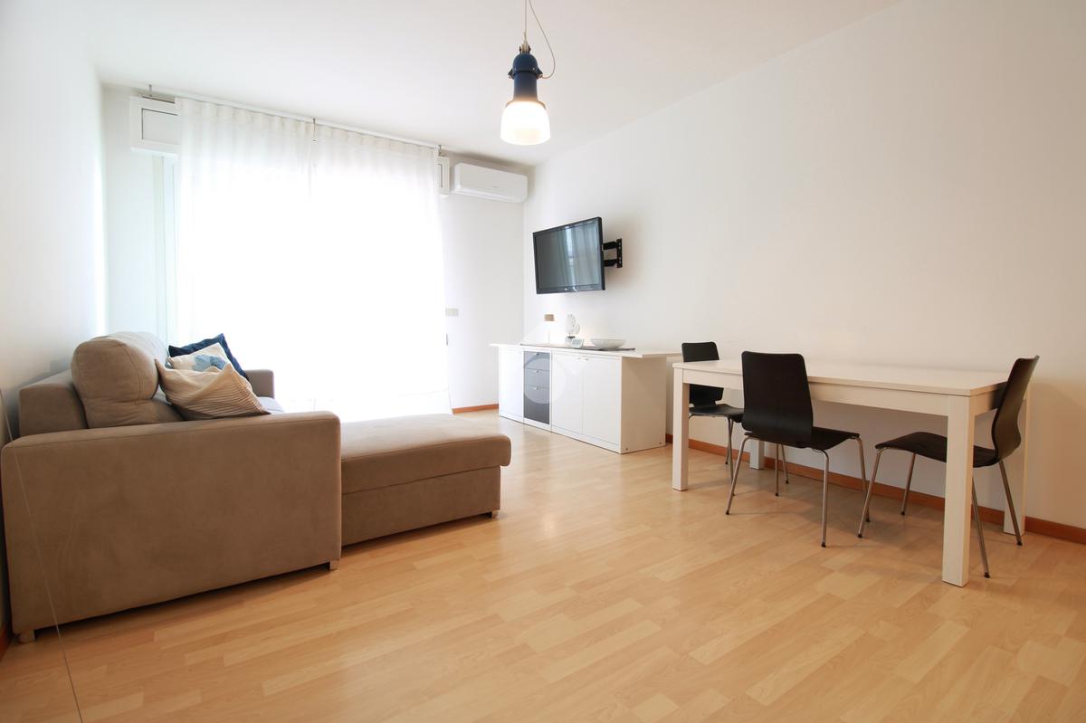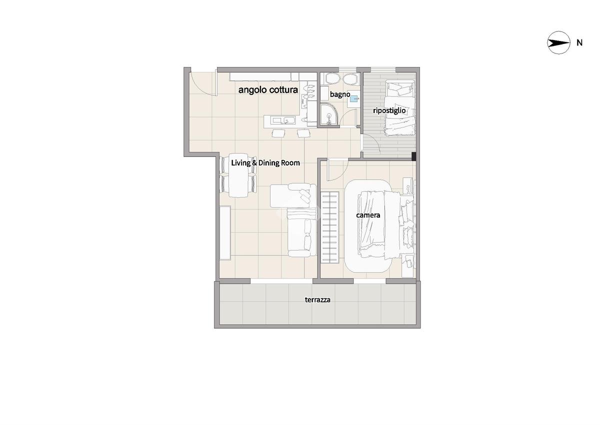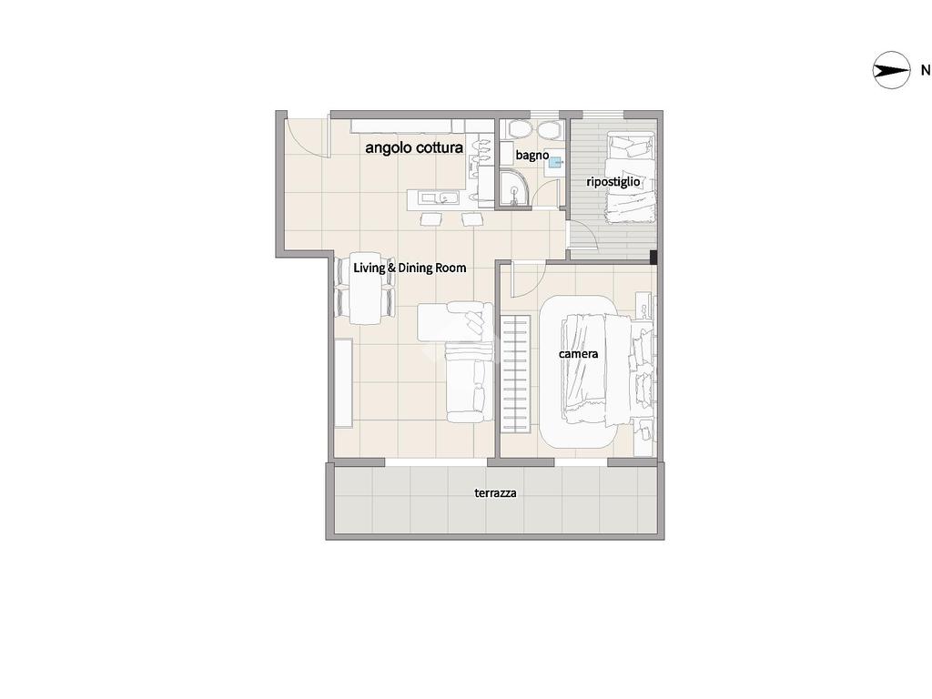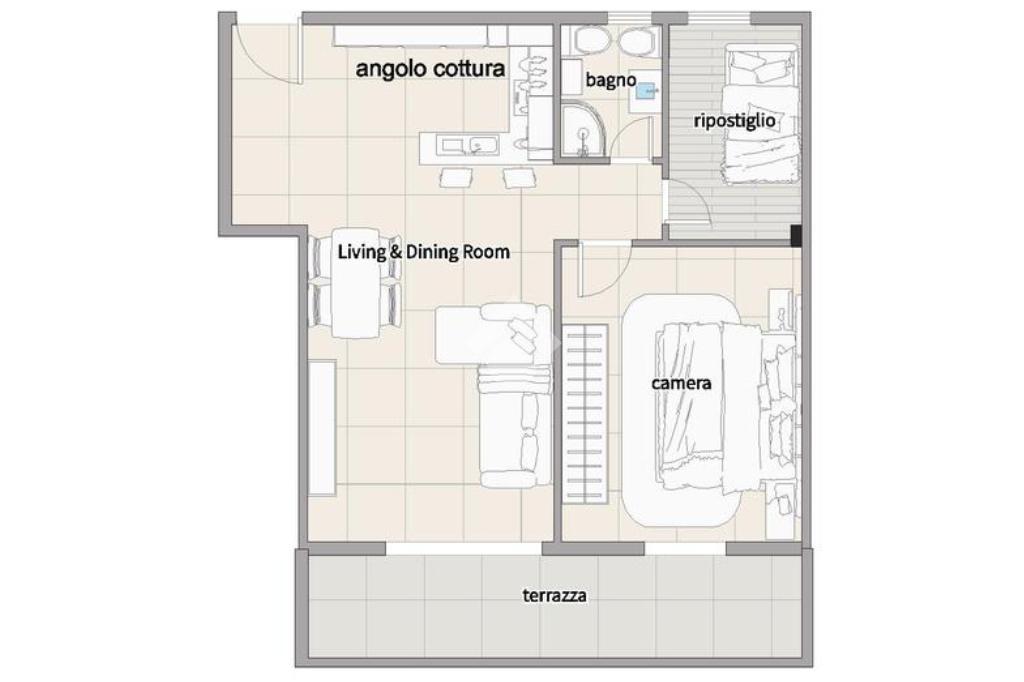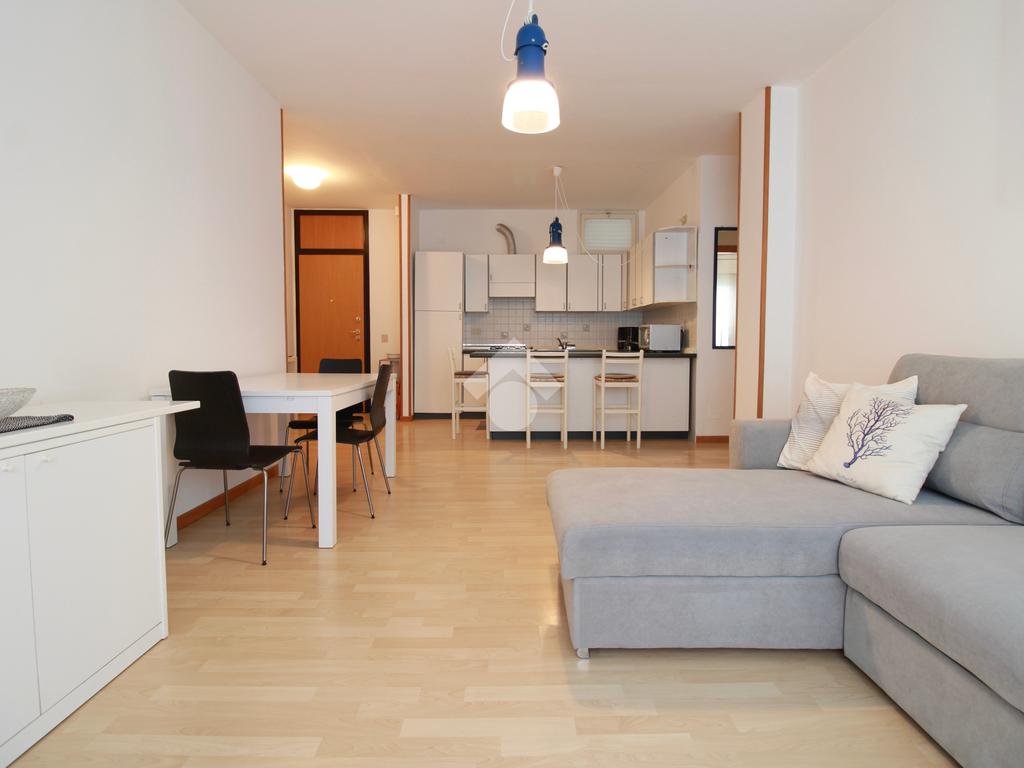 L’ingresso conduce alla zona giorno, composta da angolo cottura, soggiorno con divano, tavolo da pranzo e accesso diretto alla terrazza.