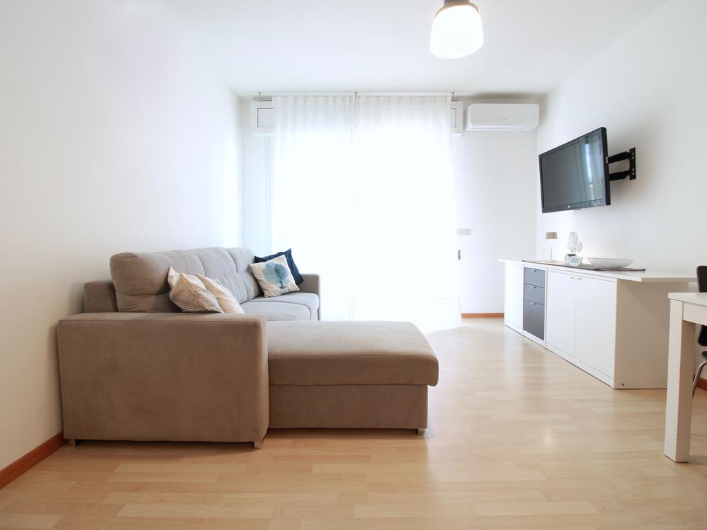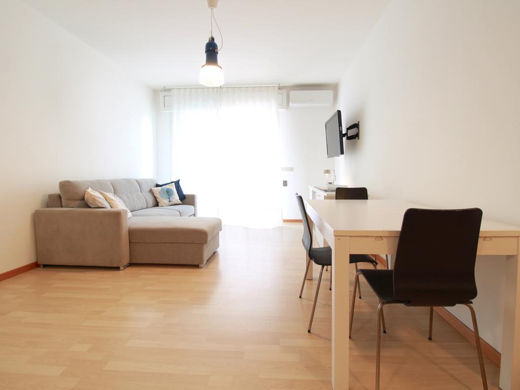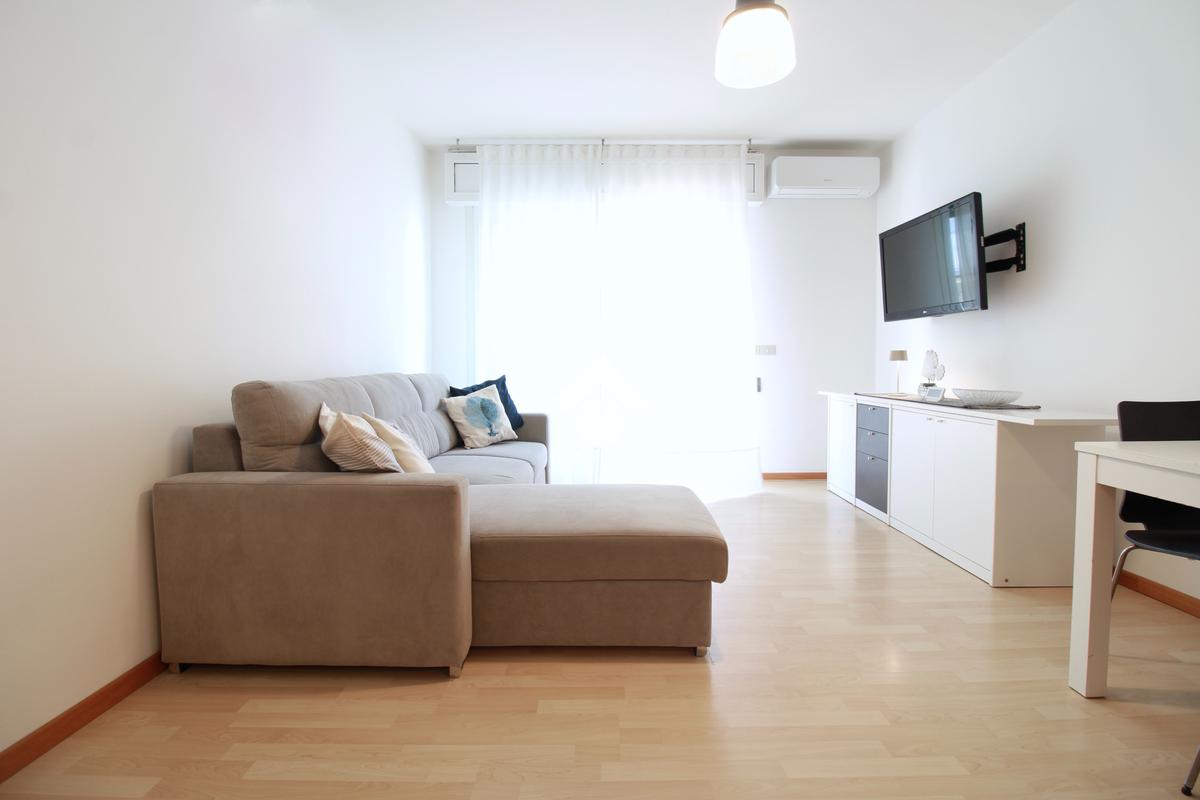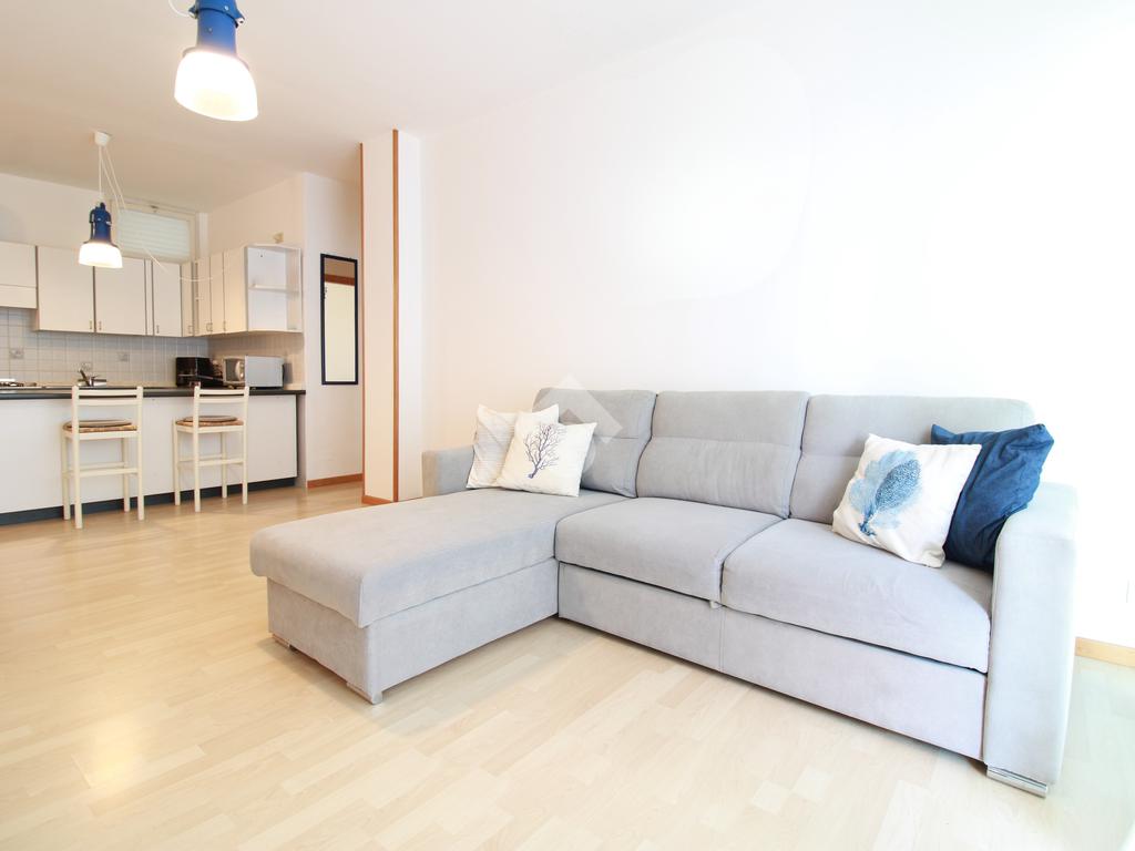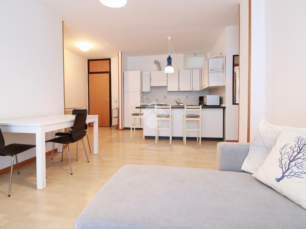 L’ingresso conduce alla zona giorno, composta da angolo cottura, soggiorno con divano, tavolo da pranzo e accesso diretto alla terrazza.