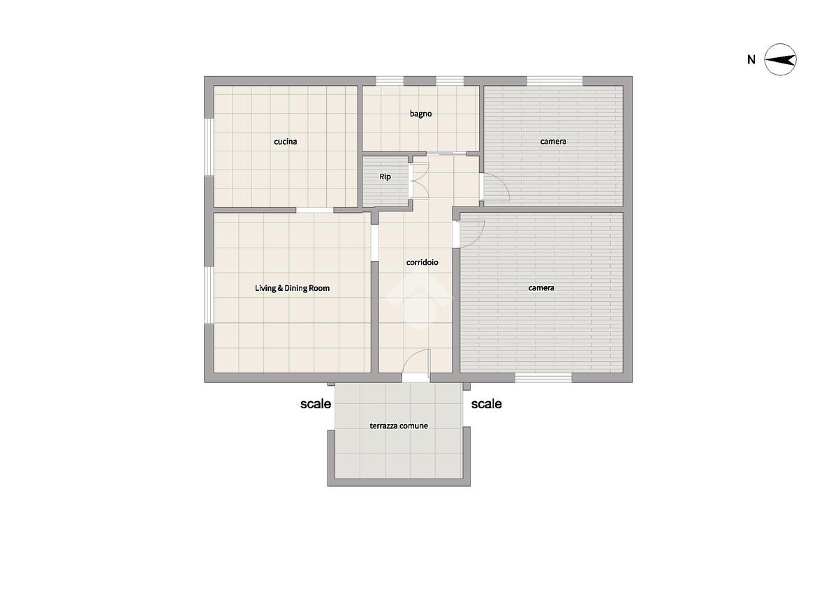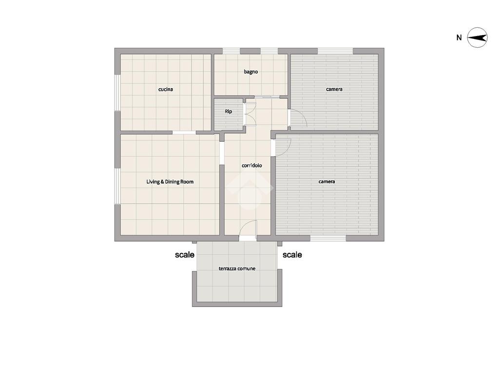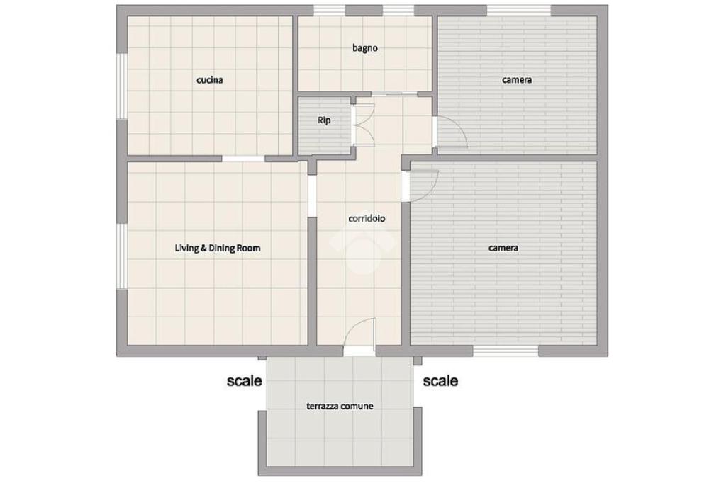 Tramite la scala esterna si accede ad un piccolo terrazzo comune, dove si trova l’ingresso dell’appartamento. L’ingresso distribuisce gli spazi: sulla sinistra troviamo la zona living, composta da soggiorno e cucina abitabile separata; proseguendo, due camere matrimoniali, entrambe esposte a sud e ben illuminate. Un pratico ripostiglio può fungere anche da cabina armadio e può ospitare anche la lavatrice. Infine, il bagno, finestrato e finemente arredato, è dotato di doccia.